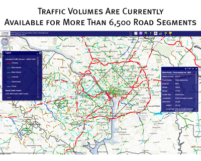 Traffic volumes are currently available for more than 6,500 points along the region's road network. The data comes from actual traffic counts that the TPB performs and from permanent count stations maintained by the state departments of transportation in Virginia, Maryland, and the District of Columbia.