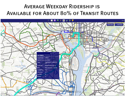 Route information is currently available for nearly 1,770 bus and rail routes, and weekday ridership numbers are available for approximately 80% of those routes. That information comes from Smartrip data, on-board rider survey results, and other methods that the transit providers use to track ridership.