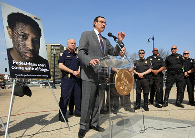 April 16, 2013 "Street Smart" Promoting Bicycle and Pedestrian Safety as Weather Warms and Days Grow LongerBetween now and mid-May, motorists, pedestrians, and bicyclists throughout the region will hear and see reminders about how to stay safe and avoid traffic accidents as warmer spring weather and longer daylight hours bring more people out on foot and on bicycles. The Transportation Planning Board's semi-annual "Street Smart" campaign, held every spring and fall, combines mass marketing messages with increased enforcement of traffic safety laws to raise awareness of bicycle and pedestrian safety. This spring's campaign is using both outdoor advertising -- mainly on bus shelters and the sides and backs of buses -- and sponsorships of traffic reports on area radio stations to reach key audiences. Some of those radio stations will also partner with local law enforcement to hold on-the-ground safety events to reach out to people in areas with higher-than-normal accident rates. The events will include safety promotions and giveaways, distribution of printed educational materials, and stepped-up, on-the-spot enforcement of traffic laws. On April 9, several local elected officials and law enforcement personnel gathered in the District of Columbia at Starburst Plaza -- the intersection of H Street NE, Bladensburg Road NE, Benning Road NE, and Maryland Avenue NE -- to kick off this spring's campaign. ![]() District Mayor Vincent Gray speaks at the kick-off for the Spring 2013 "Street Smart" campaign in Northeast Washington on Apr. 9, 2013. The busy intersection, which the District reconfigured a few years ago to improve pedestrian safety and accommodate new streetcar tracks, has historically been the site of numerous traffic accidents involving pedestrians and bicyclists. At the kick-off event, officials unveiled the marketing concept for this year's campaign -- "tired faces" -- which features individuals whose faces have been symbolically blemished by a tire tread as a way to call attention to the dangers confronting pedestrians and bicyclists. The outdoor marketing materials will combine these images of individuals with key safety messages aimed at reminding motorists, pedestrians, and bicyclists alike to be on the look-out for one another and to take steps to reduce the likelihood of accidents. Street Smart began eleven years ago, in 2002, as a cooperative effort by local, state, and federal agencies to reduce the number of bicyclist and pedestrian injuries and deaths in the Washington region. Though the number of motorists and vehicle passengers killed in traffic accidents has been declining since the early 2000s, the number of pedestrian and bicyclist fatalities has remained relatively constant. According to recent data collected by the TPB, however, the number of pedestrian and bicyclist fatalities in 2012 declined markedly from the year before, from 85 to 70. But not all jurisdictions in the region saw such a drop. While the numbers of fatalities in Montgomery County and the District of Columbia have reached all-time lows, the numbers in some of the region's outer jurisdictions have increased. As it enters its eleventh year, the Street Smart program is now a truly regional one, as all 22 of the local jurisdictions that belong to the Metropolitan Washington Council of Governments, which helps support the program, now contribute to Street Smart. In the past, the program relied mainly on federal funds made available through various state agencies and on voluntary contributions from a handful of local jurisdictions. The next Street Smart campaign is scheduled to occur in November 2013, when more motorists, pedestrians, and bicyclists will be commuting home or otherwise traveling in the glare of the setting sun or after dark thanks to the earlier sunsets that accompany both the end of Daylight Saving Time and the start of winter. But, for now, Street Smart will focus on raising awareness as the warmer spring weather and longer daylight hours mean more people will be taking to sidewalks and bike lanes for their daily commute, to run errands, or for exercise or recreation. Related Links