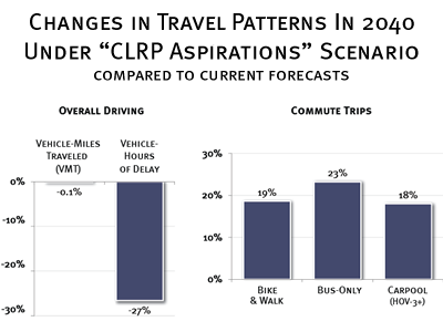 April 30, 2013 Long-Term "Aspirations" Scenario Could Bring More Travel Options, Relief From Growing DelayImagine a future in which travel options like transit, bicycling, and walking would be safer and more practical for more people in the region, and drivers would have the option to bypass congestion and enjoy more reliable travel times on many of the region's highways. That's the predicted effect of the Transportation Planning Board's "CLRP Aspirations" scenario, an alternative long-term vision for the region calling for a comprehensive network of express toll lanes and bus rapid transit on many of the interstates and other major highways in the region and concentrating future housing and job growth near current or planned transit stations. The scenario goes above and beyond the transportation improvements currently spelled out in the region's financially-constrained long-range transportation plan -- known as the CLRP -- which, by law, details all of the regionally-significant improvements that are currently expected to be built or implemented between now and 2040. Express toll lanes are the core feature of the alternative vision. The lanes would give solo drivers who are willing to pay a toll and those who choose high-occupancy alternatives like carpools and buses the option to bypass congestion and enjoy more reliable travel times. Tolls in the lanes would be higher during peak traffic periods and lower at other times in order to maintain free-flowing conditions in the lanes throughout the day, much as they are now on the new Express Lanes on the Capital Beltway in Virginia. The network would require construction or conversion more than 900 lane-miles of highway, about 150 of which have already been built for the Intercounty Connector in Maryland and the Beltway in Virginia, or are currently under construction on I-95 south of Washington. Another main component of the scenario is a 500-mile network of bus rapid transit, or BRT, that would travel on the tolled lanes, making it easier to move more people more quickly and reliably on congestion-free lanes. The BRT system would connect 70 of the region's housing and job centers with a type of transit service approaching the speed, frequency, and reliability of rail transit. The BRT network would provide much-needed transit service in the region's outer suburbs, where rail transit isn't likely to be financially-viable anytime soon. Finally, in order to increase the number of people for whom such transit alternatives would be a convenient option, the scenario calls for concentrating more than half of new housing and job growth expected between 2015 and 2040 in mixed-use activity centers near existing and planned rail and BRT stations. All together, the transportation components of the scenario would cost in the neighborhood of $50 billion over 20 years. Projected revenues from the toll lanes and fares from the new transit service would total around $20 billion, covering about 40% of the total cost of the proposal. According to the latest TPB analysis, the scenario's three mutually-supportive initiatives, when combined, would result in a 19% increase in the number of commute trips made on foot or by bicycle in the region, relative to current projections -- no small change, considering that many of those trips would have otherwise been made by car on already congested roadways. Use of bus transit for trips to and from work also increases under the scenario -- by 23% -- and the number of trips by carpools with three or more people jumps by 18%. And although the total overall amount of driving in the region barely changes, vehicle-hours of delay drops almost 27% compared to current forecasts. The CLRP Aspirations scenario has evolved somewhat over the last couple of years. Most notably, the extent of the toll lane network has been scaled back in an effort to reduce costs and in response to new federal rules regarding the conversion of non-tolled lanes to tolled ones. The tools and basic assumptions used to analyze the scenario have changed, too. The TPB used its new, finer-grained travel model, which better predicts transit trips and trips on foot and by bicycle, and a more recent version of the CLRP, which includes a few more major transit and highway projects that are expected to be built by 2040. In addition to analyzing the full CLRP Aspirations scenario, the TPB also studied the effects of implementing just one or two of the three main components without the others. The analysis found that implementing the network of toll lanes and BRT, absent shifts in land-use, would provide relief from growing delay for drivers and lead to higher rates of carpool use, but would result in higher total amounts of driving and no change in the number of trips on foot or by bicycle. The latest version of the Transportation Planning Board's long-term "CLRP Aspirations" Scenario, which envisions a network of express toll lanes and bus rapid transit and more concentrated growth near transit, would have significant and meaningful impacts on everyday travel patterns in the Washington region. The increases in the use of non-motorized transportation modes and reduced travel delay for drivers would go a long way to making it easier to travel around the region. Related Links To download a PDF version of this issue of TPB Weekly Report, click here. MWCOG.org - Homepage | Search | Transportation | Environment Health & Human Services | Housing & Planning | Homeland Security & Public Safety Cooperative Purchasing | Publications | Events Calendar Committee Business | News Room | About COG | Doing Business With COG Human Resources | Contact Us | Site Map | Privacy Policy | Accommodations Policy