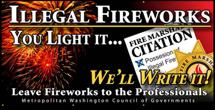 Some jurisdictions allow a variety of fireworks regulated by the federal Consumer Product Safety Commission. Legal devices in many of the surrounding jurisdictions include cones, sparklers, sparkling devices and novelties. Illegal fireworks include Roman candles, skyrockets, aerial shells with mortars, and firecrackers (Check with your locality).   All fireworks are prohibited in some local areas, including Montgomery County (MD), Prince George’s County (MD) and the City of Alexandria (VA).