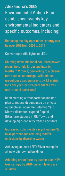Alexandria established the EcoCity charter in 2008 making the city a place where people can live healthier and economically productive lives while reducing environmental impact. The Charter was followed by the 2009 Alexandria Environmental Action Plan which recommended 353 actions to achieve this goal. The effort is a partnership between the city its citizens the environmental policy commission and Virginia Tech’s Alexandria campus.