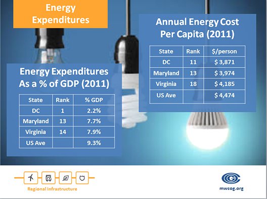 During the discussion officials frequently mentioned metropolitan Washington as an energy efficient region—a major goal of area leaders. Recent data shows the region has been outpacing the rest of the country in reducing its energy use between 2005 and 2011. While the average American is using 8 percent less energy residents in D.C. and Virginia lowered their energy use by 11 percent and residents in Maryland did so by 12 percent. Area residents also pay less for energy. For example energy costs average less than $3900 annually per person in the District of Columbia. The national average is more than $4400. This is caused by a combination of improvements in energy efficiency greater use of transit and other fuel-efficient transportation lower electricity rates and the Region’s concentration of business sectors that use less energy than manufacturing heavy areas.