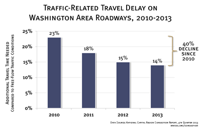 In its most recent quarterly analysis, the TPB found good news for drivers and other road users over the past few years: a 40% decline in average congestion-related delay between 2010 and 2013. A trip that would normally take 30 minutes in traffic-free conditions took about 37 minutes on average in 2010, but just 34 minutes in 2013.