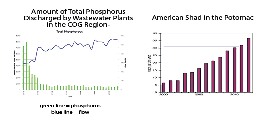 Charts showing phosphorus levels decreasing and shad (fish) populations increasing (See Potomac Water Quality fact sheet below for more information)