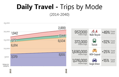 Close to a million of the new trips forecast by 2040 are anticipated to be on foot or by bicycle, almost as many as will be made by single drivers. That represents growth of nearly 50% over the next 26 years, more than for any other travel mode in the region.