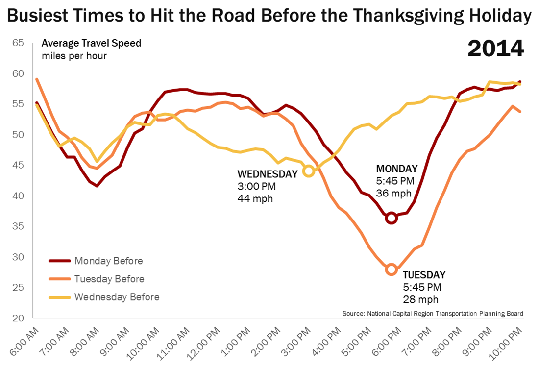 The leftover turkey is almost gone and many people are turning their attention to other holidays as 2016 comes to an end. But traffic researchers at the TPB have taken a quick look back to see how traffic conditions on area roadways played out in the days leading up to Thanksgiving Day. Their analysis points to the best and worst times for holiday getaway travelers to hit the road on their way out of town.