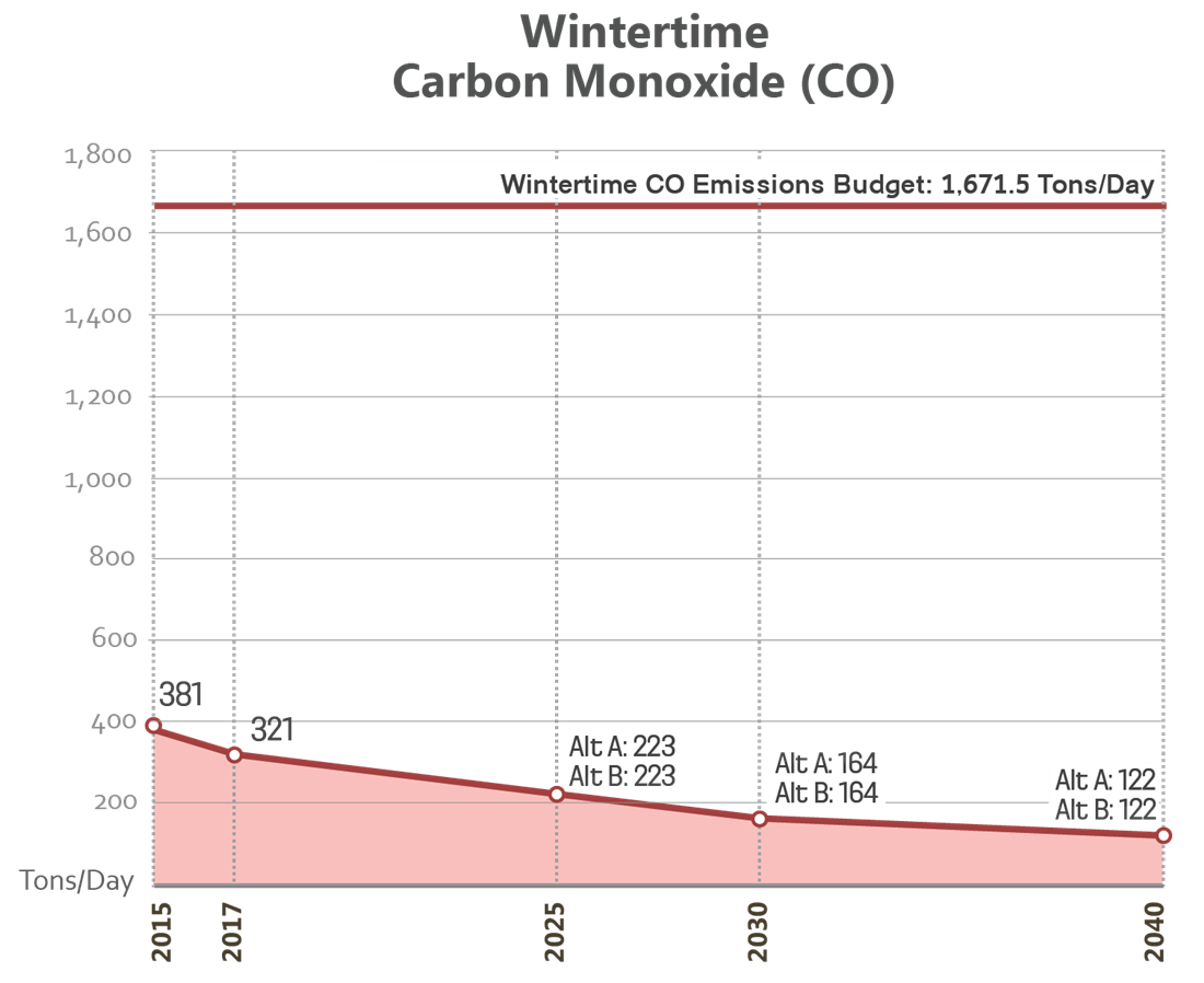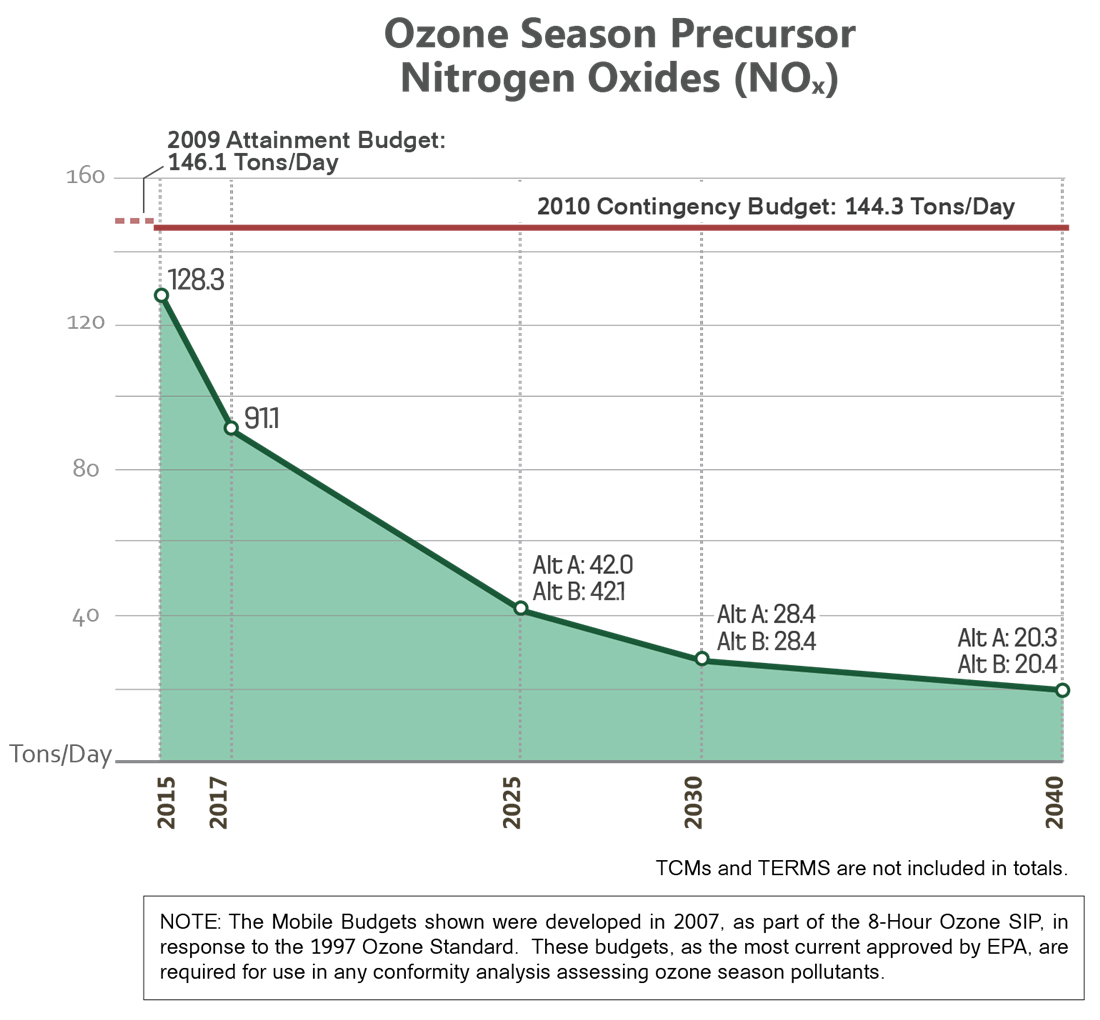 Analysis of the 2015 Amendment to the CLRP shows reductions of emissions of all three main pollutants between now and 2020. The data show that estimated emissions are well within the mobile source emissions budget for each pollutant for 2017, 2025, 2030, and 2040. These results reflect the impact of better vehicle standards, cleaner fuels, and fleet turnover, as well as changes in development patterns, investment in transit and other travel options, and improved operational efficiency or area roadways.
