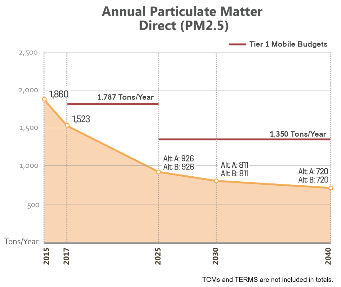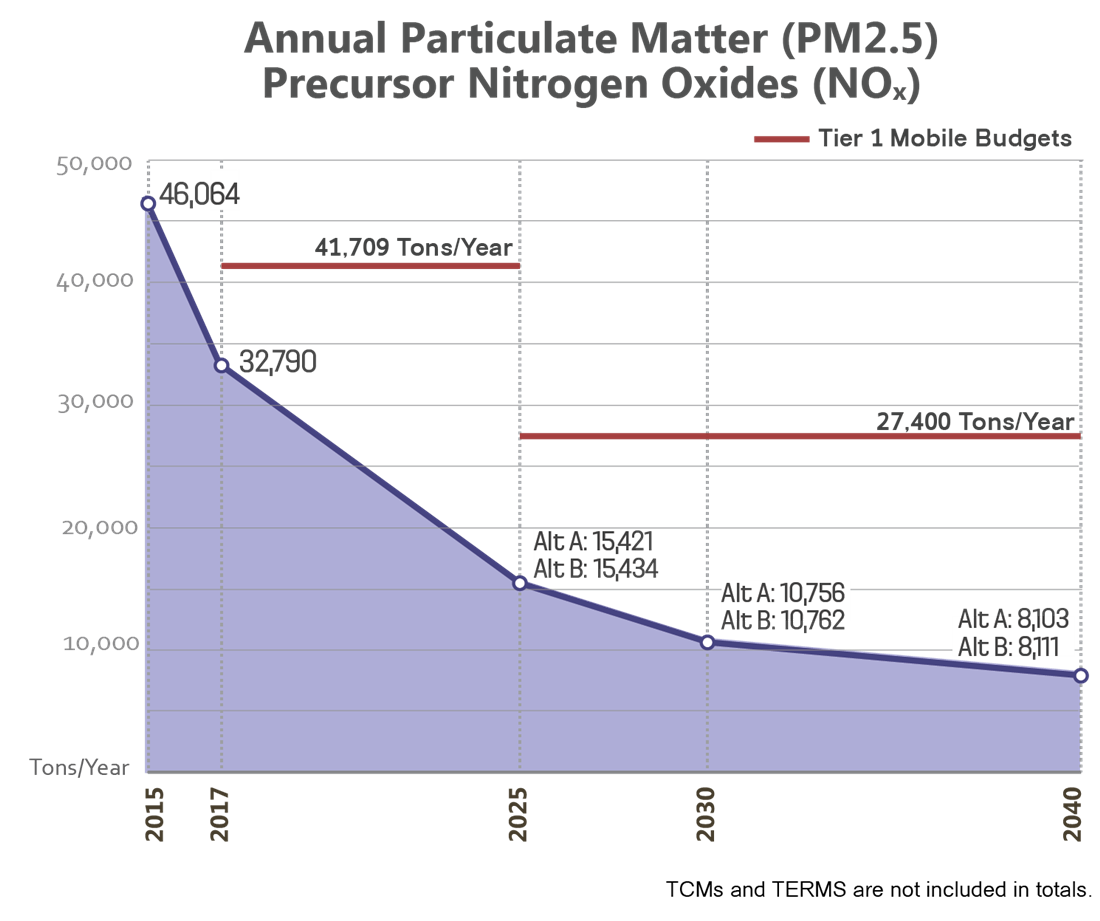 In addition to NOx and VOCs, the plan also tracks and estimates emissions of particulate matter of less than 2.5 micrometers in diameter (PM2.5). PM2.5 is of special concern because these ultra-fine particles can easily lodge in the lungs of humans and cause health problems. Since concern about PM2.5 has developed relatively recently, PM2.5 was not tracked or estimated in 1990.